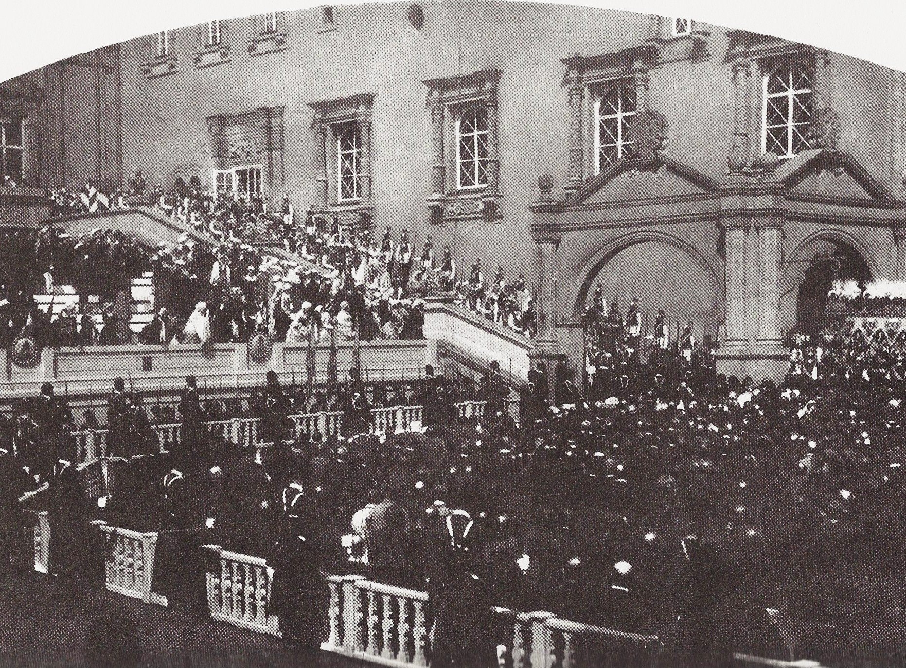 Он необыкновенно высок, на целую голову выше правофлангового юнкера первой роты, и веско внушителен, пожалуй даже величествен. Юнкера его зовут Статуей Командора. И правда, он похож на Каменного гостя, когда изредка, не более пяти-шести раз в год, он проходит медленно и тяжело по училищному квадратному коридору, прямой, как башня, похожий на Николая I, именно на портрет этого императора, что висит в сборном зале; с таким же высоким куполообразным лбом, с таким же суровым и властным выражением лица. С юнкерами он никогда не здоровается вслух. Да у него и нет вовсе голоса, а какое-то слабое сипение.Московский Кремль. Красное крыльцо. Император Александр III с императрицей Марией Федоровной спускаются по Красному крыльцу