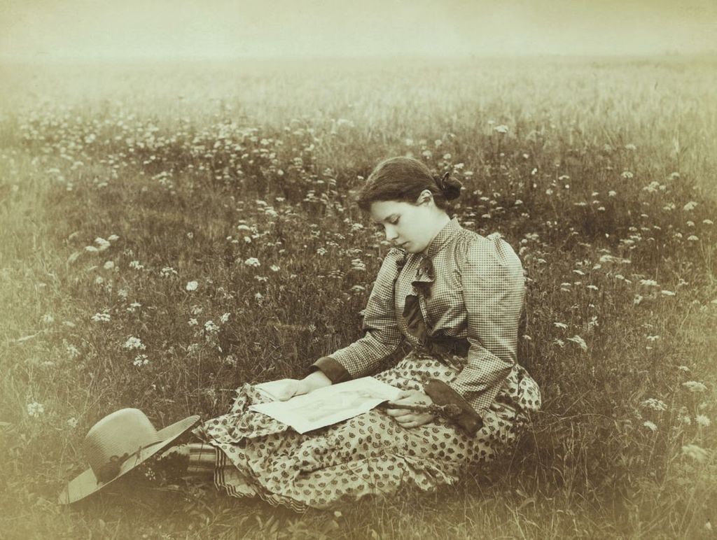 На меже, посреди буйной ржи, окруженная связанными снопами, сидела крестьянская девушка из Всехсвятского, синеглазая, с повитой вокруг головы светло-русой, точно серебристой косой.