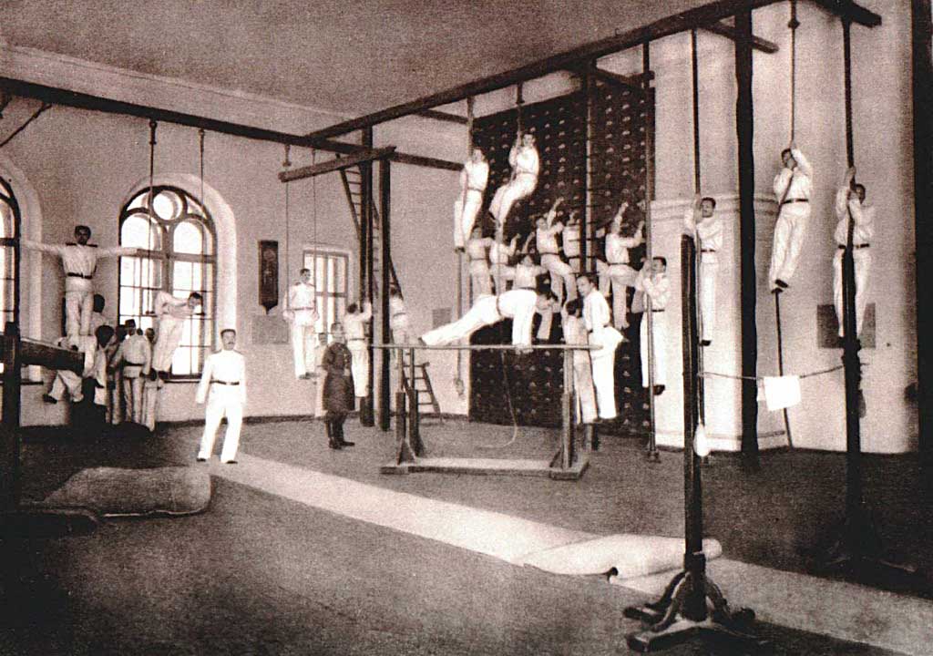 Учить лекции и делать чертежи приходилось в спальне, сидя боком на кровати и опираясь локтями на ясеневый шкафчик, где лежали обувь и туалетные принадлежности.Гимнастический зал - занятия гимнастикой