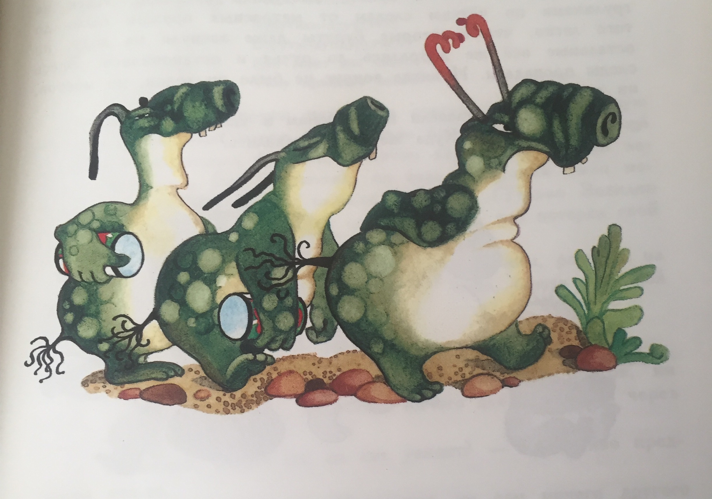 Шутки в сторону, вещица именно мировоззренческая. На основе четырёх книг из серии Bottersnikes & Gumbles маленькие австралийцы познают основы экологии, журналистики и экономики, а также технологии предвыборных манипуляций. Не приведи Господи, сочинения пишут. Смигглз - судьба творческой личности при тоталитаризме. Или "Король-Злохвост: образ власти роковой". Впрочем, надеюсь, что у антиподов методисты поумнее, и детишки просто потешаются над незамысловатым текстом и смотрят картинки, получая радость и удовольствие. Без радости и удовольствия тут обойтись трудно. Ляпики лучше получились у австралийского художника: