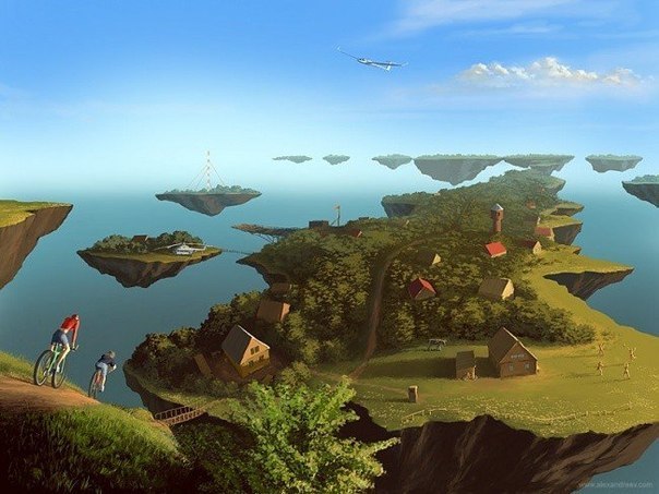Итак, давайте по порядку. В будущем нашу планету или какую-то очень на неё похожему постигла ужасная катастрофа, произошёл взрыв, в результате которого земная кора отделилась от ядра и разбилась на огромные, и не очень, участки суши, которые начали вращаться по орбитам вокруг него. И так роль солнца теперь выполняет раскалённое ядро, которое освещает летающие острова снизу. Во время взрыва так же произошли изменения и в атмосфере, она стала более плотной и теперь по ней совершено свободно могли летать воздушные корабли, небесные автобусы и баржи. Самолётостроение в такой атмосфере, по словам автора, не прижилось, так как реактивные двигатели не могут работать на сиропе, на который теперь похож воздух. Людям поначалу требовались для дыхания скафандры, но со временем они приспособились и спустя много-много лет у них стали лёгкие как у альпинистов и они даже научились сами плавать по воздуху без всяких приспособлений, но не далеко и не глубоко. Во время чтения моей любимой позой стал «фейспалм».