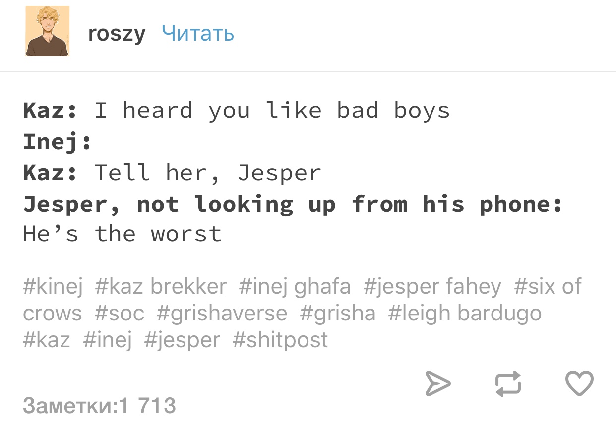Мне понравилась вся шестёрка. Каз своей загадочностью и умом. Инеж своим умением бесшумно передвигаться и добротой. Нина своей весёлостью и самопожертвованием. Матиас своей жёсткостью и храбростью. Джеспер своей лёгкостью и подвижностью. Уайлен своей стойкостью и упрямством.