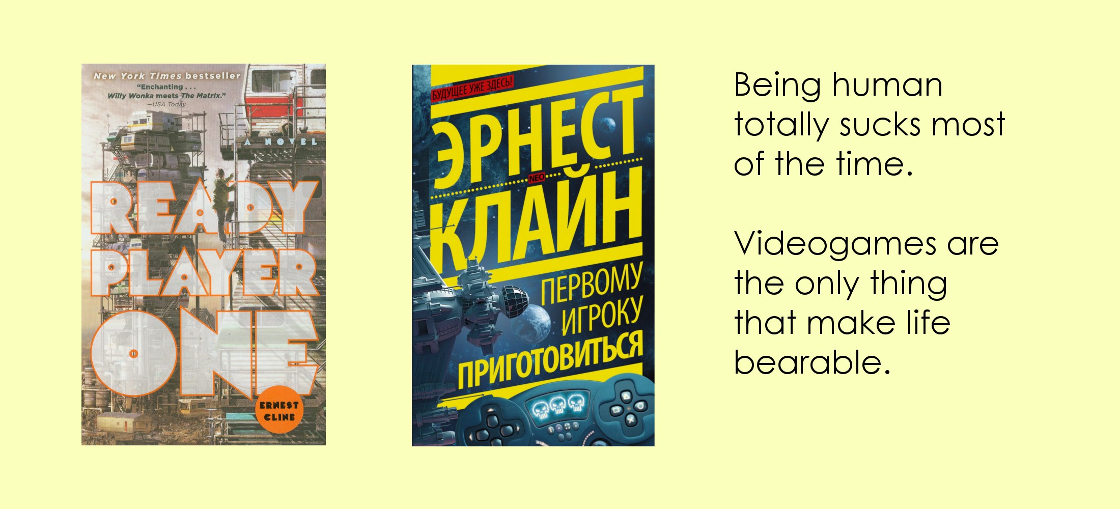Главный герой живет в нищете и надеется получить приз в охоте на пасхалку. Автор пасхалки фанател по 80м, поэтому большую часть жизнь гг тратит на игры\фильмы\музыку тех времен. Непосредственно игровой процесс почти не описывают, кроме пути к той самой пасхалке. О нудном каче говорится в 2х словах. Да, в сюжете есть и романтическая линия и внезапный сюрприз от лучшего друга, и, конечно же, борьба со злобной и бездушной корпорацией.