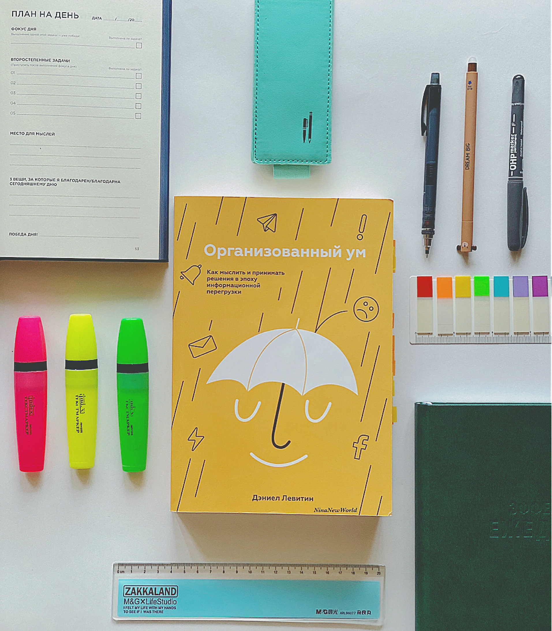 Как будто поняв, что я почти забыла мамины слова о том, что порядок в голове начинается с порядка в доме, автор начинает заново организовывать ум именно с окружающего мира. Нет, тут не про магическую уборку. Скорее про организацию рабочего места, метод ведения заметок, разбор почты и классическое «где бл* эти е** ключи?».
