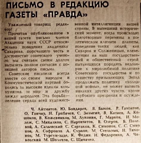 Заканчивается повесть на оптимистичной ноте, поэтому и нельзя упрекнуть автора в антисоветскости, ни в пессимистичности. Конец старого иноходца печален и предсказуем, но остался ещё человек, который совершенно не расписывается в бессилии и ошибочности своих суждений. Это не Солженицын с его морализаторством и лицемерием. В одной из рецензий прочитала про обращение в газету «Правда», подписанное Айтматовым. Спасибо тому человеку, который об этом упомянул. Заяндексила его. Оставлю здесь.