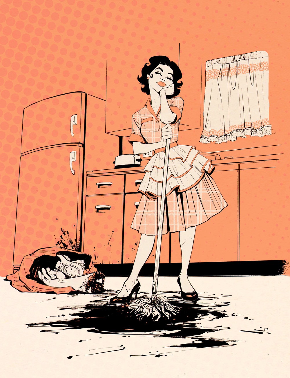 jcherbadzhy3 января 2022 г.Читать далееЗабавный комикс, который наверное должен был ввести меня в состояние культурного шока, но не смог. Вся из себя ухоженная идеальная домохозяйка, проживающая в 50е года, оказывающаяся беспощадной убийцей, предпочитающей холодное оружие. Но довольно заурядный сюжет, увы, не зацепил меня, но проблема раскрывается в романе все еще актуальная. Плюс у графического романа есть один плюс - очень неплохая рисовка для американского комикса, а еще стилизация с брызгами крови на разворотах. Даже жаль, что он меня не впечатлил.
