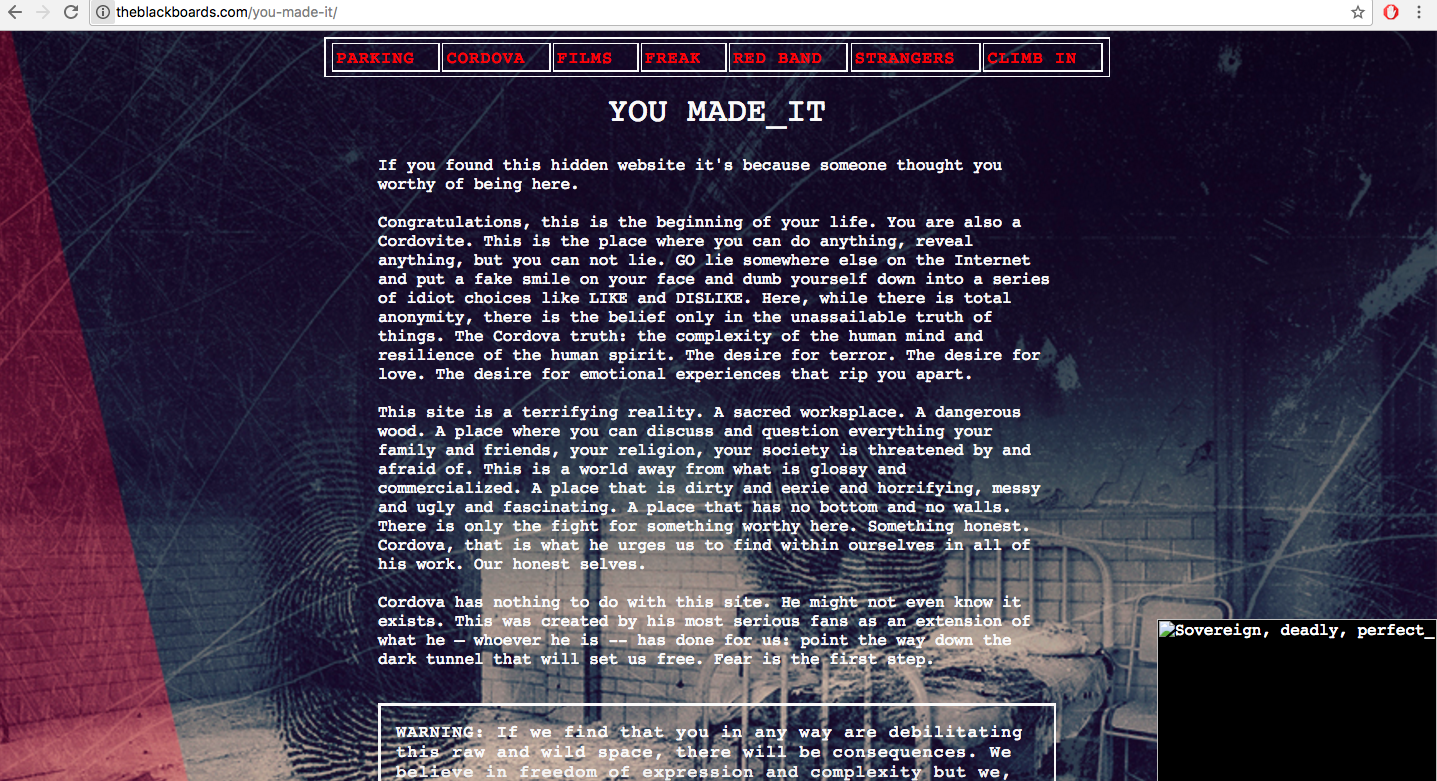 Читать далееЯ предполагала, что книга крутая, но не думала, что она настолько мастерски вписана в реальную жизнь. Мало того, что в сюжете грамотно намешано реальных и вымышленных людей, фактов, отсылок... Так создатели еще и потрудились написать сайтик с легендарной "Черной доской" - пристанищем фанатов Кордовы, на который смогут попасть только самые любопытные читатели...