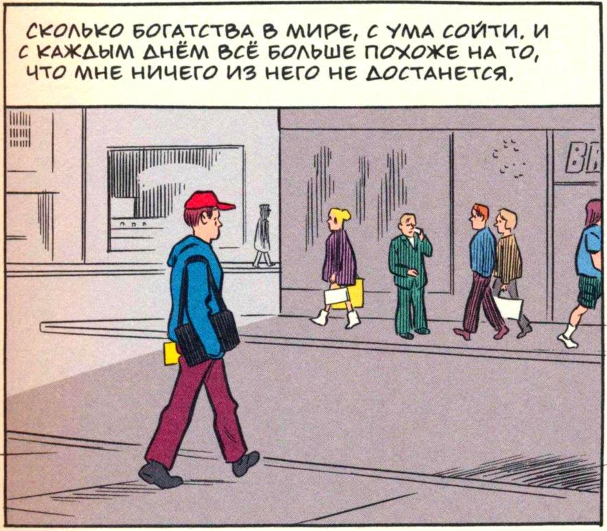 И любовь ли движет Джеком? Он сам превращается в безжалостного насильника, наставляющего бластер на ребенка. Навязчивая идея о спасении возлюбленной доводит героя до маниакального состояния. И его «приходы» от вещества, которое позволяет путешествовать во времени, наглядно иллюстрируют кошмарную изнанку сознания. Как художник Клоуз работает в манере комиксов прошлого века, с их пестрым и наивным колоритом, четкими силуэтами, футуристическими пейзажами. Бумажный уют резко констатирует с грубостью сюжета и сюрреалистичностью некоторых образов.