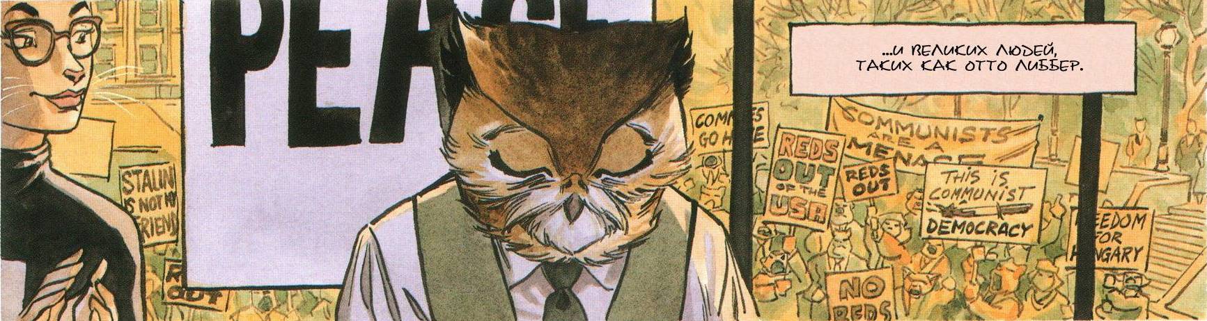 Сыщик-кот с девятью жизнями (и на этот раз он это проверит!). Земноводный наниматель Блэксэда, таскающийся по Вегасу и выставкам современного искусства (о, эти милые отсылки к Поллоку, Ротко и - особенно тонко - к Хопперу). Ученый-сова, который почти Оппенгеймер. Сенатор - боевой петух, начинающий ту самую американскую "охоту на ведьм". Худющий койот (или волк?) - классический русский, про которого не поймешь, то ли он жертва, то ли шпион. И, конечно, баран-продюсер и вуду-обезьяна, творящая над ним свою сумасшедшую нью-орлеанскую магию.Две потрясающих, совершенно разных истории.