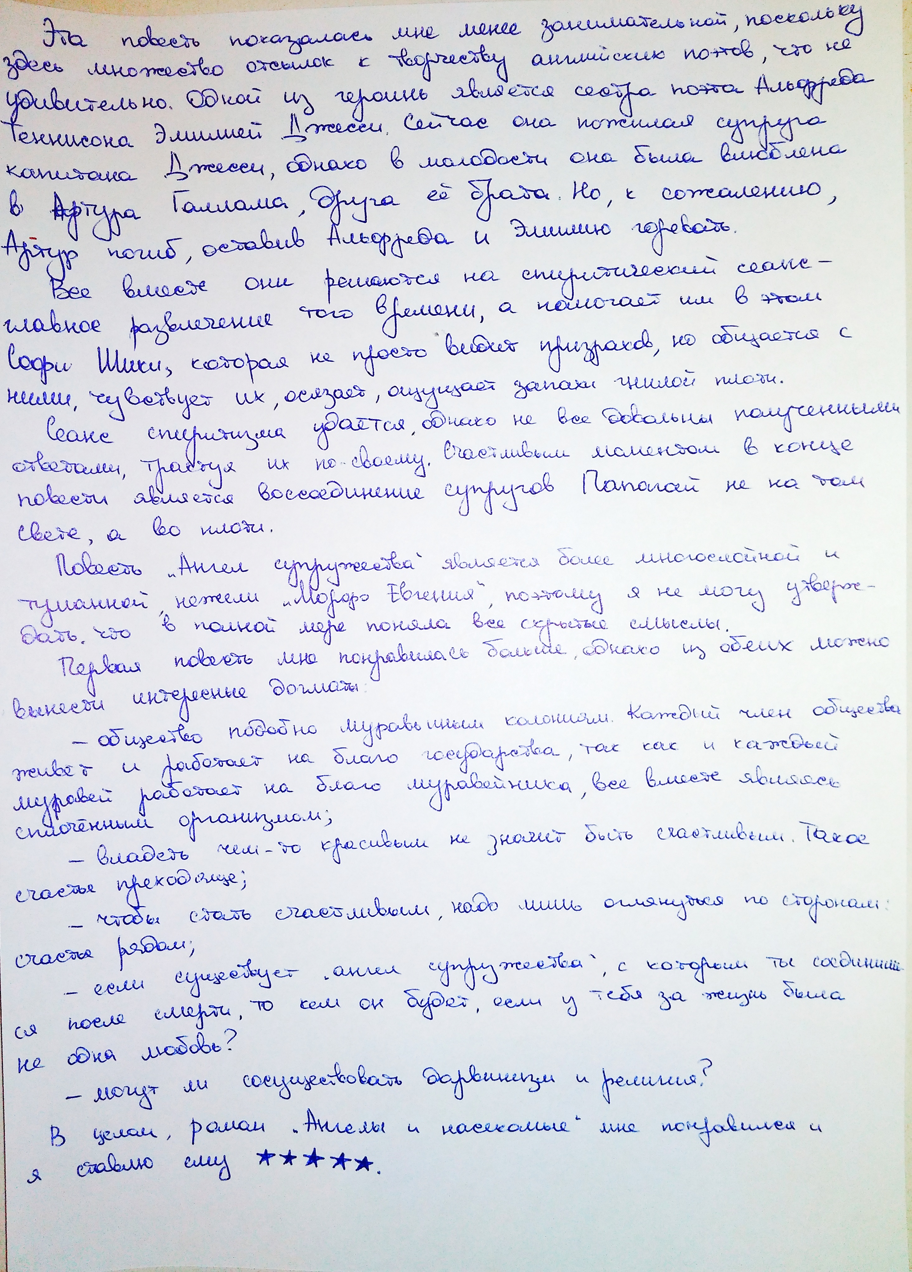 Про "Ангела супружества" ограничиться двумя строчками будет совсем несправедливо. Да и никак невозможно. Поскольку помимо идеи вызывания духов людей, ушедших в мир иной, мы оказываемся в достаточно плотной истории, где есть трагическая история любви одной из наших героинь (кстати, сестры поэта Альфреда Теннисона) с его другом, тоже поэтом, так неожиданно скончавшемся в очень молодом возрасте. Сам Теннисон неоднократно потом в течение жизни обращался в своем творчестве к его памяти, зато в повести и он, и все родственники укоряли несчастную девицу, да и несложившиеся родственники если б могли, тоже стыдили бы, да воспитание не позволило, так быстро, всего через 10 лет вышедшую замуж за другого. Не говоря уж о других случаях забвения его памяти ею. Но Альфред нам покажется и с другой стороны, неожиданным, где мужская дружба и привязанность к другу может иметь несколько ипостасей. Итак, один из вечеров столоверчения, оказавшийся на грани драмы. А мы оказались на волне чувств и в самой глубине бурления восторженных натур, где наградой нам дивные строки, которые своими то диалогами, то монологами приотворяют дверь в мир чувств. Без этих стихотворных вкраплений не ощутилась бы атмосфера, порой почти готическая, которая привела к совершенно неожиданному финалу. И что-то в рассуждениях о смерти, о потустороннем бытие в общей атмосфере даже цепляло.