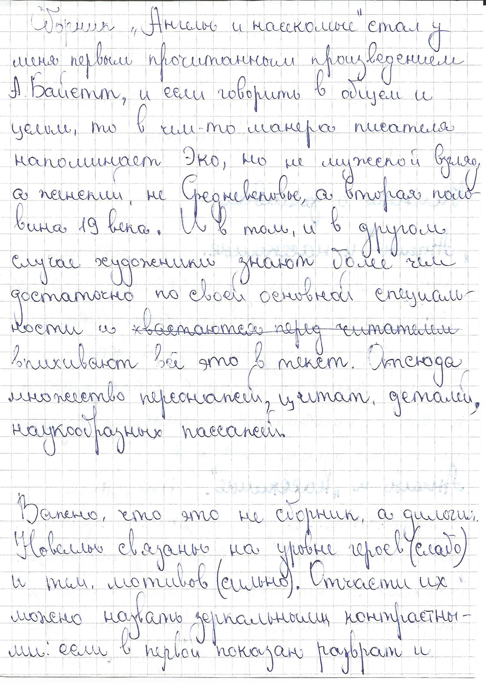 В целом, книгу эту, безусловно, порекомендовала бы знакомым, с комментарием забыть о том, что она от автора «Обладать». Очень колоритно передана атмосфера викторианской эпохи, всё такое изысканное без манерности, интересные характеры и сюжеты. У меня возникла ассоциация с картинами голландцев, на которых изображено множество деталей и каждая из них радует глаз и вызывает желание вглядеться пристальней.