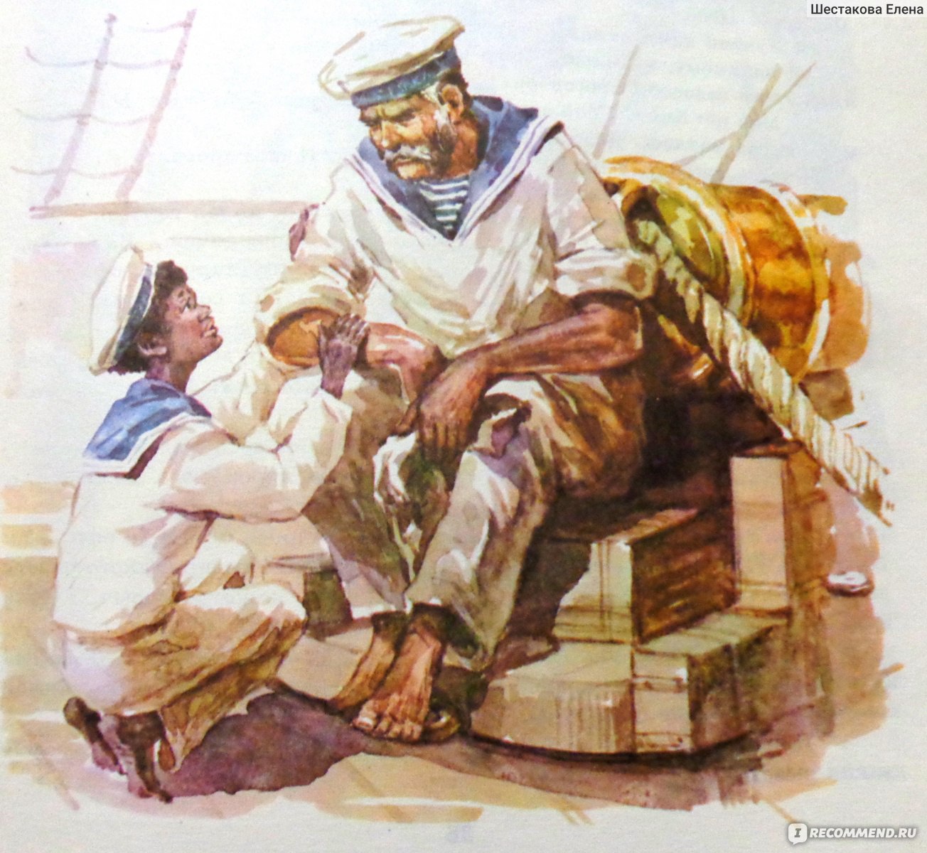 Читать далееПопалась мне в руки премилая книжечка Станюковича с его морскими рассказами. Она, хоть и в мягкой обложке, зато вся с картинками и добрыми текстами, как показали два прочитанных мною рассказа. Первым, для знакомства, я выбрала этот, самый популярный здесь, и не прогадала! Трогательная история усыновления чернокожего арапчонка, бывшего раба, которого в итоге оставили на корабле юнгой. Написан он с душой, прекрасным языком русского писателя. И, оказывается, по этому рассказу есть одноимённый фильм 1952 года с таким набором актёров - Борис Андреев, Вячеслав Тихонов, Николай Крючков, Марк Бернес, Михаил Пуговкин и другие...
