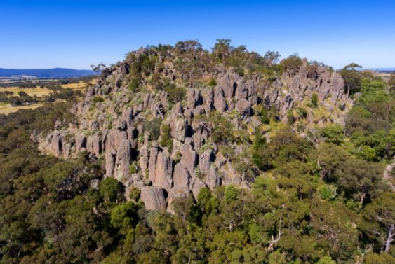 И, в завершении, несколько слов о самой Висячей Скале. Это вулканическое образование, торчащее посреди полей центральной Виктории. Вот вид на него с упоминавшегося в книге Верблюжьего Горба, высшей точки горы Маседон.
