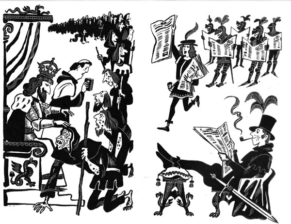Рубашки эти считались лучшим предохранительным средством от всякого греха, и мои рыцари так усердно рекламировали их с помощью красок и трафарета, что скоро во всей Англии не осталось ни одной скалы, ни одного камня, ни одной стены, где не было бы надписи, видной за милю.Впрочем, его нельзя обвинить исключительно в корысти, он старается уничтожить рабство, подорвать влияние церкви и создать республику. Но из этих его начинаний ничего не выходит, народ отшатывается от него, как только церковь отлучает его. Лишь малое число верных людей остается при нем, а вся Англия восстает против.