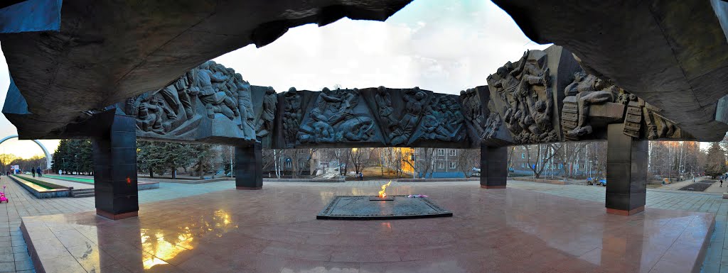 Когда я была в Новокузнецке, обратила внимание на массивные памятники. Под стать закрытому гористой местностью обзору, темной воде и пыли, дыму от металлургических заводов, они создают облик города, и в то же время диктуются им. Мемориал ВОВ «Венок славы» - высокий черный четырехгранный барельеф сцен военного времени. Что важно, наблюдатель должен зайти внутрь, чтобы увидеть скульптуры. Когда тебя окружают боль и хаос войны, нет мыслей о доблести, становится страшно.