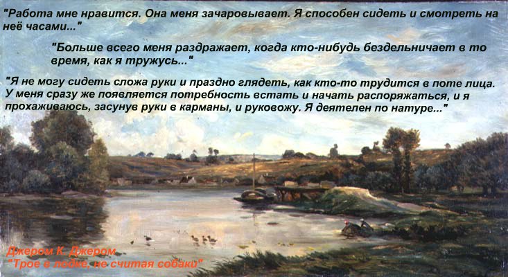 Прелесть данного произведения в его атмосфере: когда трое друзей садятся на лодку вместе со своими верным псом читатель отправляется вместе с ними (столь ярко описан Альбион). Я получил удовольствие от книги главным образом благодаря красочным описаниям Темзы, прилегающих городов и трактиров.
