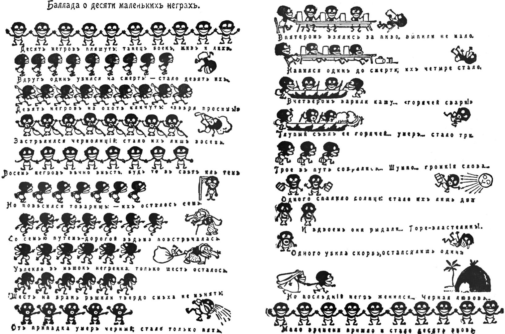 Двенадцать негритят.И наша версия изначально была оптимистической. Вот её славное прошлое: по данным Википедии, в 1903 году стишок был таким: