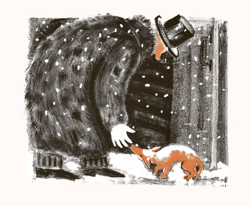 Во всяком случае, в кафкианских декорациях тихо сеющегося снега, словно пепла и звёзд, падших с небес, Каштанку и мир заметало звёздами, и всё бы кончилось плачевно, если бы её не подобрал странный, безымянный человек в чёрном, от которого пахло конями а̶п̶о̶к̶а̶л̶и̶п̶с̶и̶с̶а̶.