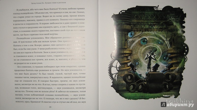 Аноним28 ноября 2018 г.Читать далееПоскольку с творчеством По я раньше не сталкивалась, не знаю, как читались бы эти рассказы в обычной книжке с серыми листочками... А вот от глянцевых страниц и потрясающих иллюстраций из этого подарочного издания я просто оторваться не могла! Как же все-таки влияет качество издания на восприятие, даже немного обидно за саму литературу.