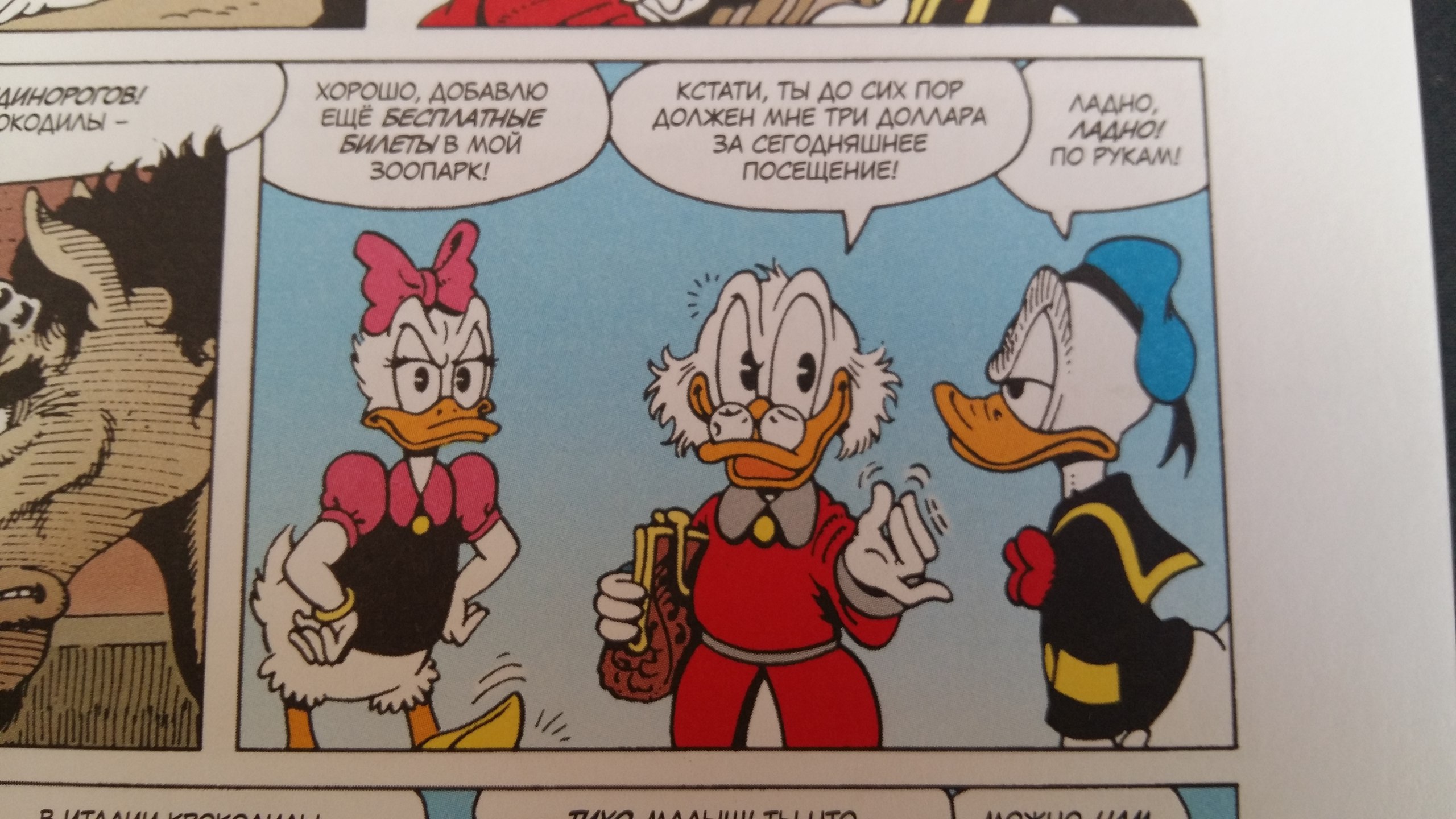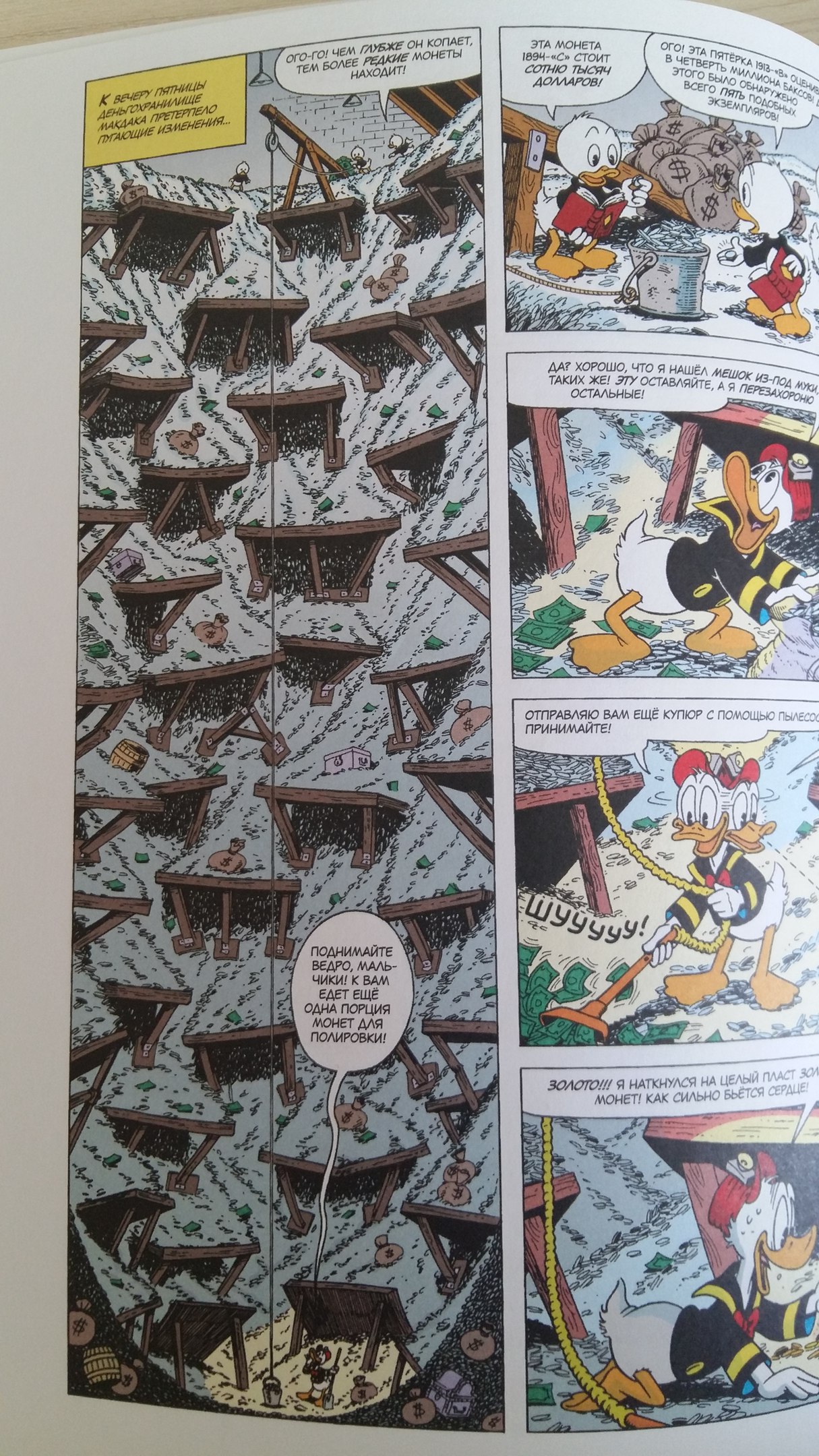 Истории более замысловатые. Путешествие Дональда за крокодилом, сразу меня покорило. И, конечно про шахту в деньгах Скруджа. Здесь нам преподносят и его отношение к деньгам. Оно правда немного не вяжется с другим комиксом, когда он скупал монеты, чтобы стать единственным обладателем. Но эта вселенная динамичная, может и поменяться в мелочах. Главное остается на месте способность Скруджа из всего извлечь выгоду!