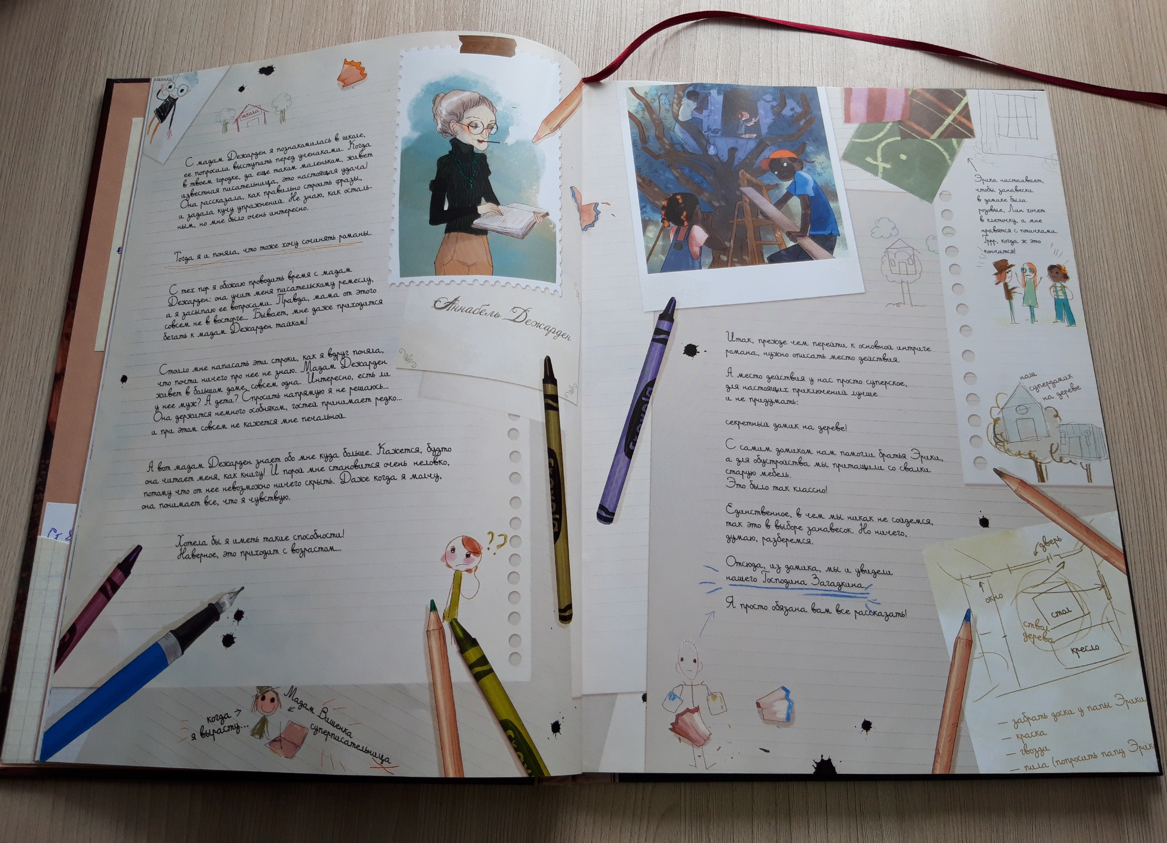 Яркие приятные глазу, иллюстрации. Повествование в формате комикса и дневниковые вставки, стилизованные под настоящий девочковый дневник, с рукописными пометками, зарисовками и вклейками. Эту книгу не просто приятно читать, но ещё и дико интересно рассматривать. Ведь каждая страничка содержит множество важных деталей, из которых и строится вся история.