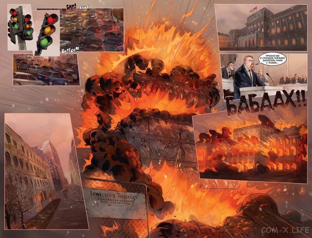 И это я еще не говорю о стильности рисованного Петербурга, который в комиксе выглядит гораздо более приятным местом, чем в кинотеатре.Сюжет арки "Игра" начинается с побега идейного, но маньячного террориста Разумовского из тюрьмы и из-под надзора психиатра.