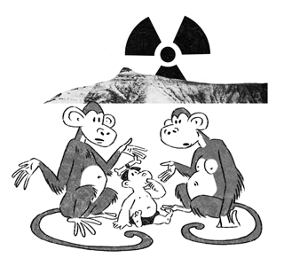 (Речь идёт о гипотезе, что обезьяны стали людьми под воздействием повышенного уровня радиации, в том числе и солнечной. А.Б.Соколов приводит обоснованные возражения, но картинка всё равно хорошая.)