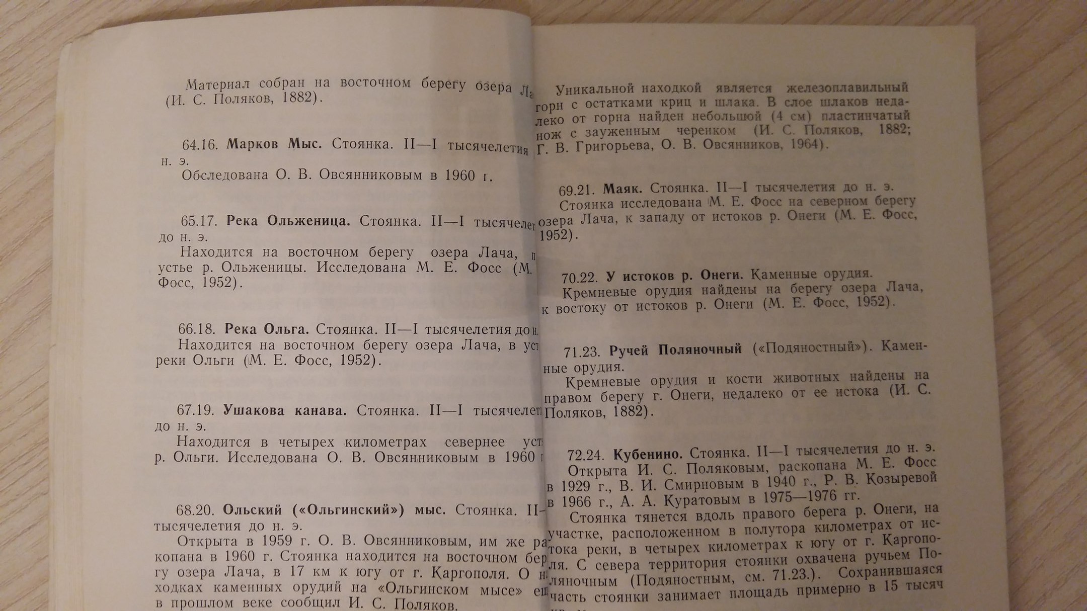 Данная работа представляет из себя каталог стоянок, поселений и находок, сделанных на территории Архангельской области в ходе экспедиций советского времени (и немного дореволюционного). Каждый абзац представляет собой описание места, сделанных находок и иногда описание культурных слоев и стратиграфии (тут уже чистая археология идет). Выглядит это всё вот так