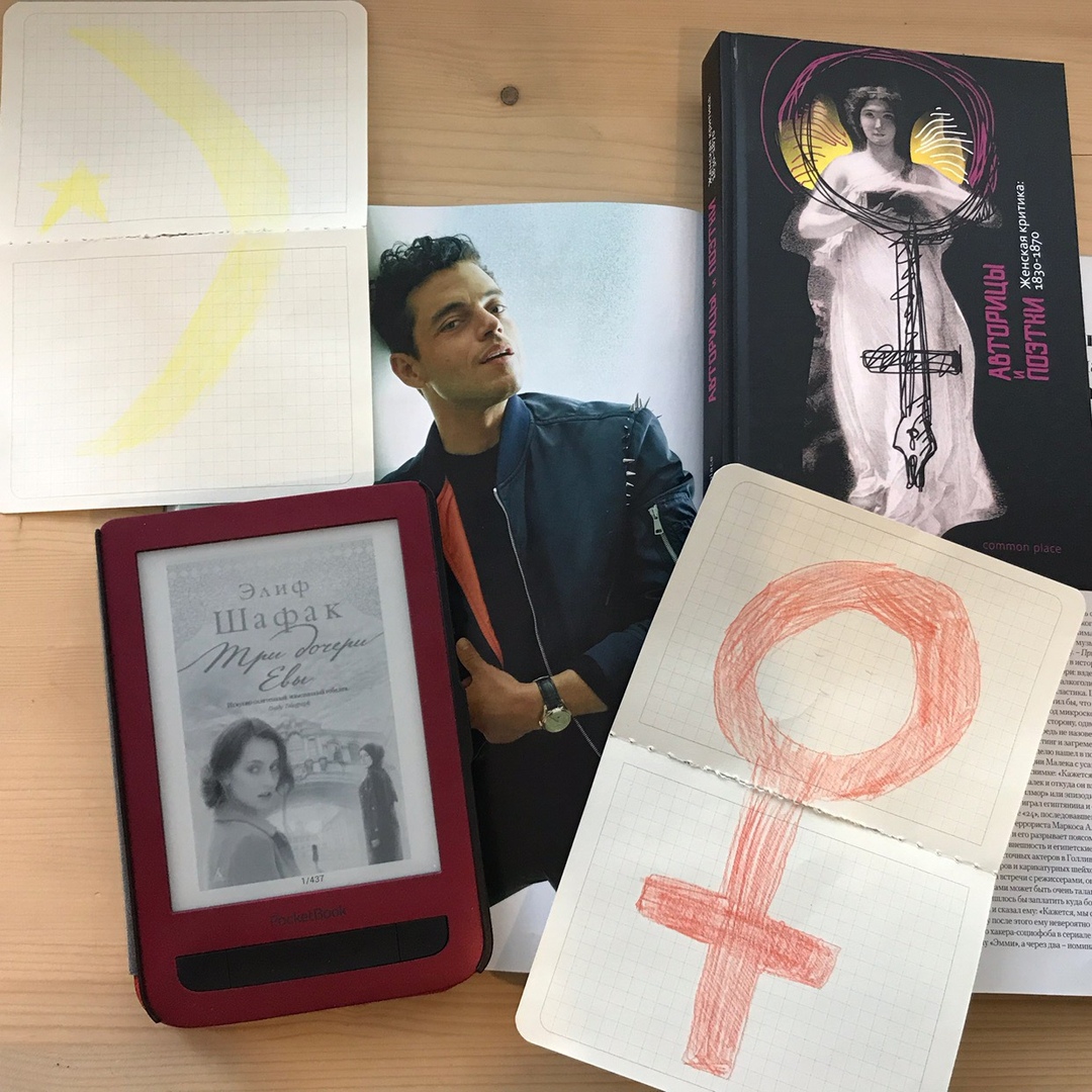 поскольку книга посвящена исламу и феминизму, а у меня нет ничего, связанного с ними, пришлось выкручиваться: за феминизм у меня отвечает книга с феминитивами в названии, за ислам - Рами Малек (артист египетского происхождения), а если это не прокатывает, то я попыталась нарисовать соответствующие символы: Зеркало Венеры для феминизма и Полумесяц для ислама.