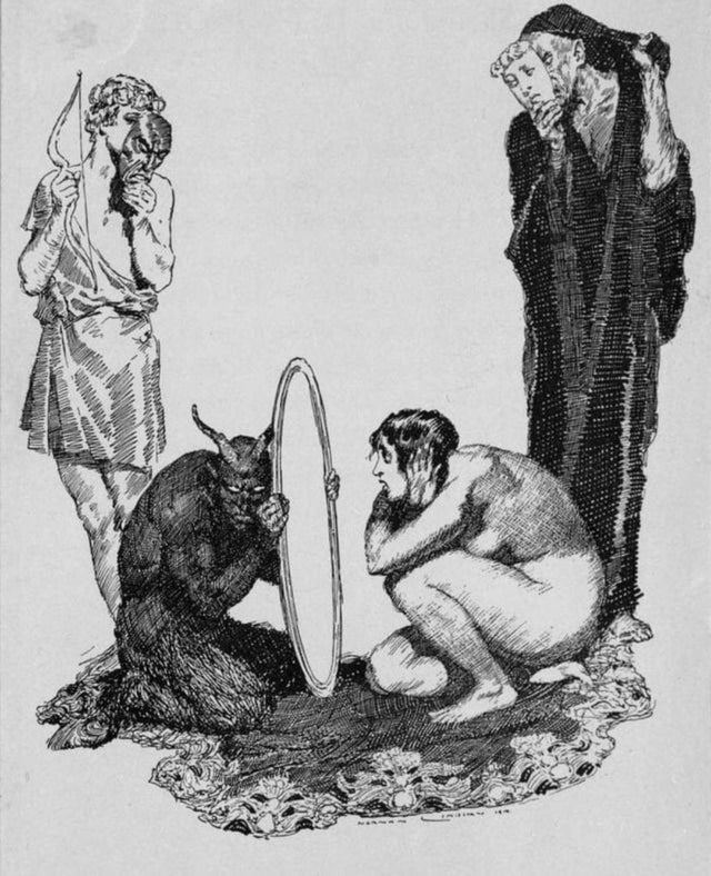 Дыхание мерно восстанавливается. Я намеренно не замечаю своего отражения... Я смотрю на случайных узников, подёрнутых зыбкой мглой стеклянного гроба. В зеркале их грехи обрели собственные лица. Сартр шепчет мне из глубины вечности, что подлинный ад несёт "другой". Хм... Так почему же кажется, что в адовой комнате под масками "других" скрылись выпущенные на волю безумные воплощения собственных мыслей героев? "Как черви" голые грехи тонко нанизывают лихорадочные сознания пленников, опутывают липкой тиной бездейственного соучастия, связывают общим узлом наготы равнодушия. Каждому страшно выпустить наружу сокровенную бабочку мысли, обнажить её уродливый облик, порочащий зеркальную зыбь собственного зеркала внутри...
