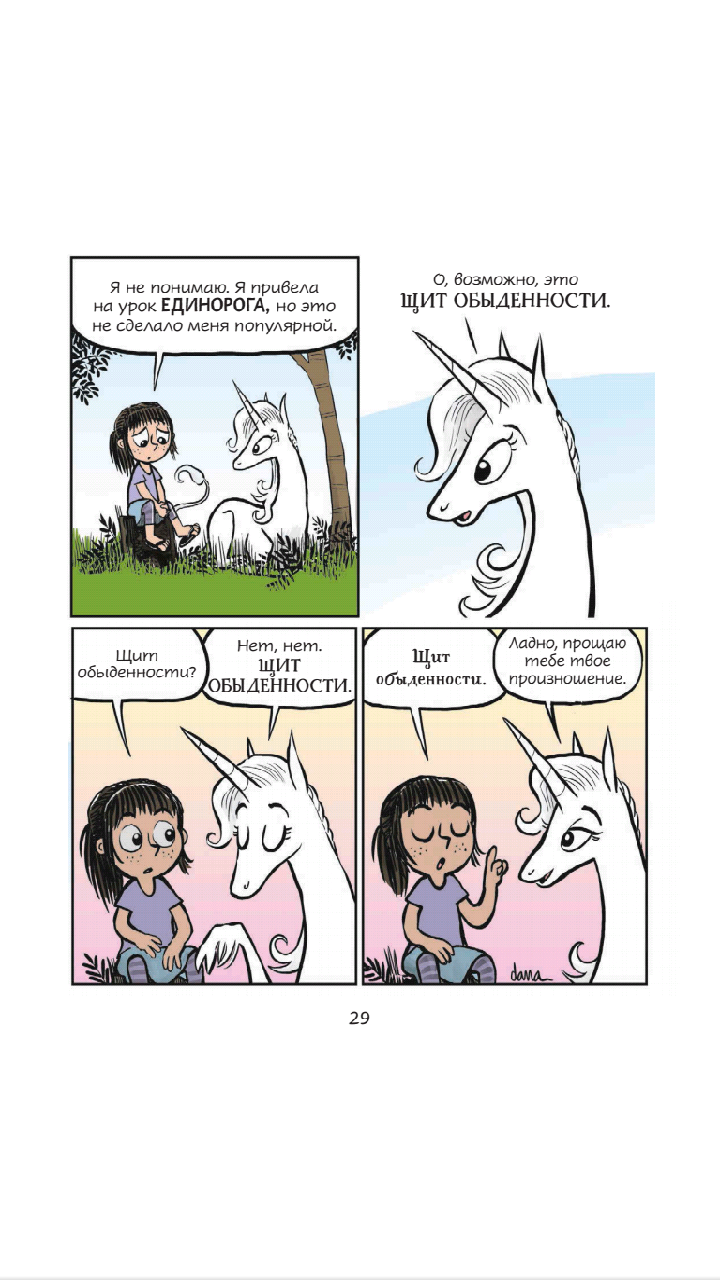 Помимо коротких историй в конце книги можно найти интересные бонусы - пошаговые инструкции, как нарисовать главных героинь и организовать пижамную вечеринку, нарисовать мультик или комикс, а также интересные факты о единорогах.P.S. Щит обыденности - самая зачётная вещь, мне кажется, я им обладаю))
