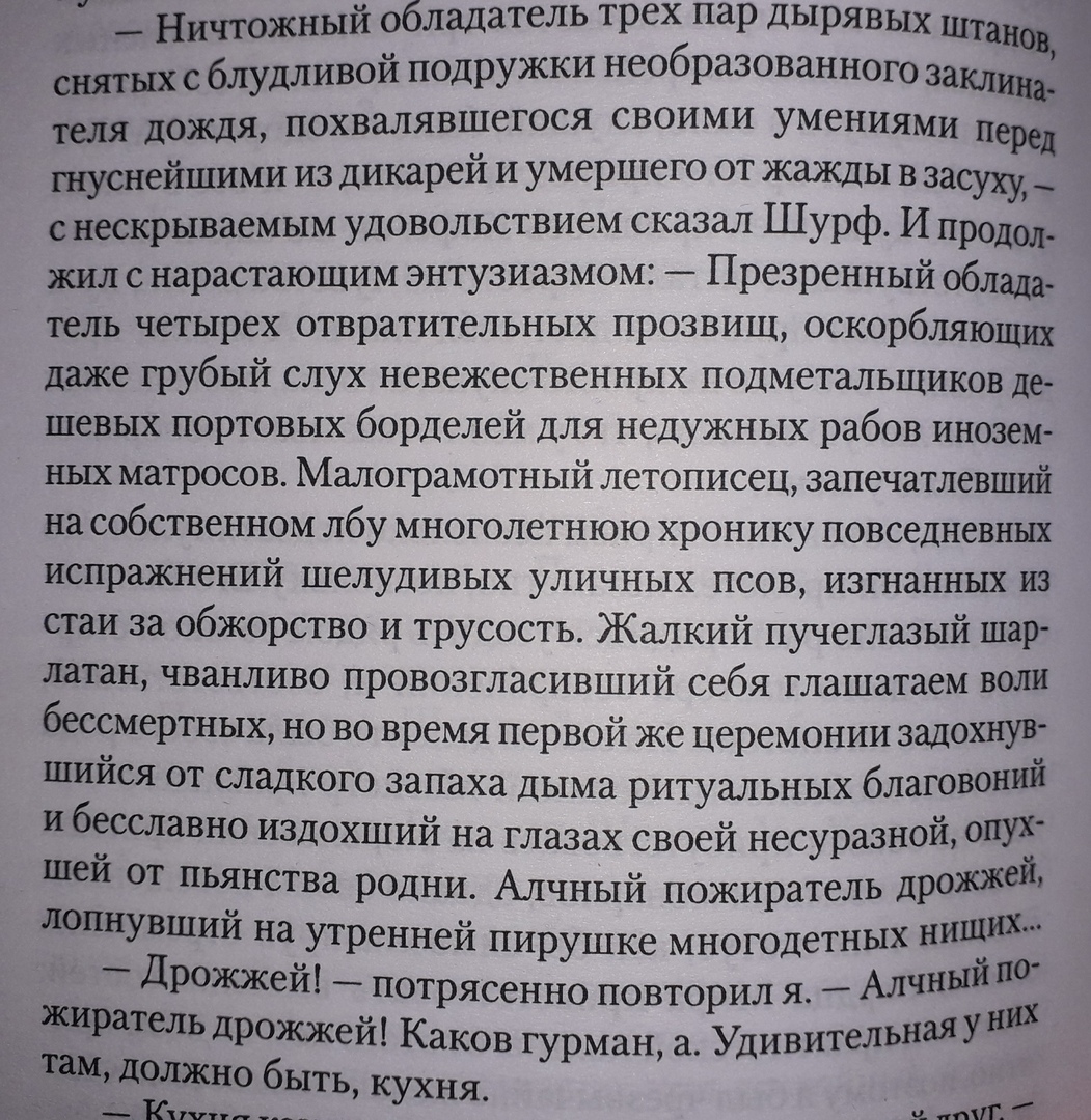 Аноним25 июля 2021 г.Читать далееНу во первых дырку в небе над вами и дюжину вурдалаков под одеяло за описания посиделок за едой! Для умиротвореного чтения о похождениях СероМакса необходимо либо быть сытым, либо крайне не впечатлительным (в этом случае за чтение садиться смысла не вижу), либо иметь под боком вкусный кофе/чай и кучу съестной дряни! Иначе придется ерзать на стуле и каждые 10 строчек отвлекаться на попытки послать зов в ближайший трактир, ну или на попытки безуспешно сдержать свои порывы.
