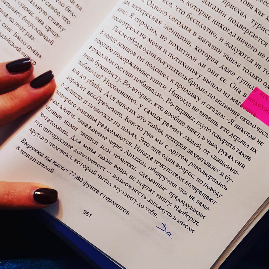 Шон - живой. Он точно также, как и я в прошлом, тянет спину, таская коробки, бегает по магазину в поисках интернет-заказов и считает их злом, у него даже есть опечатки в книге, но это привет переводчику. У него также есть крутые книжные идеи, но он сумел воплотить их в жизнь: создал "Клуб случайных книг", в котором рассылает читателям совершенно случайные книги, организовал конкурс анонимных открыток и целую кучу других мероприятий, в которых хотели бы поучаствовать многие из нас.