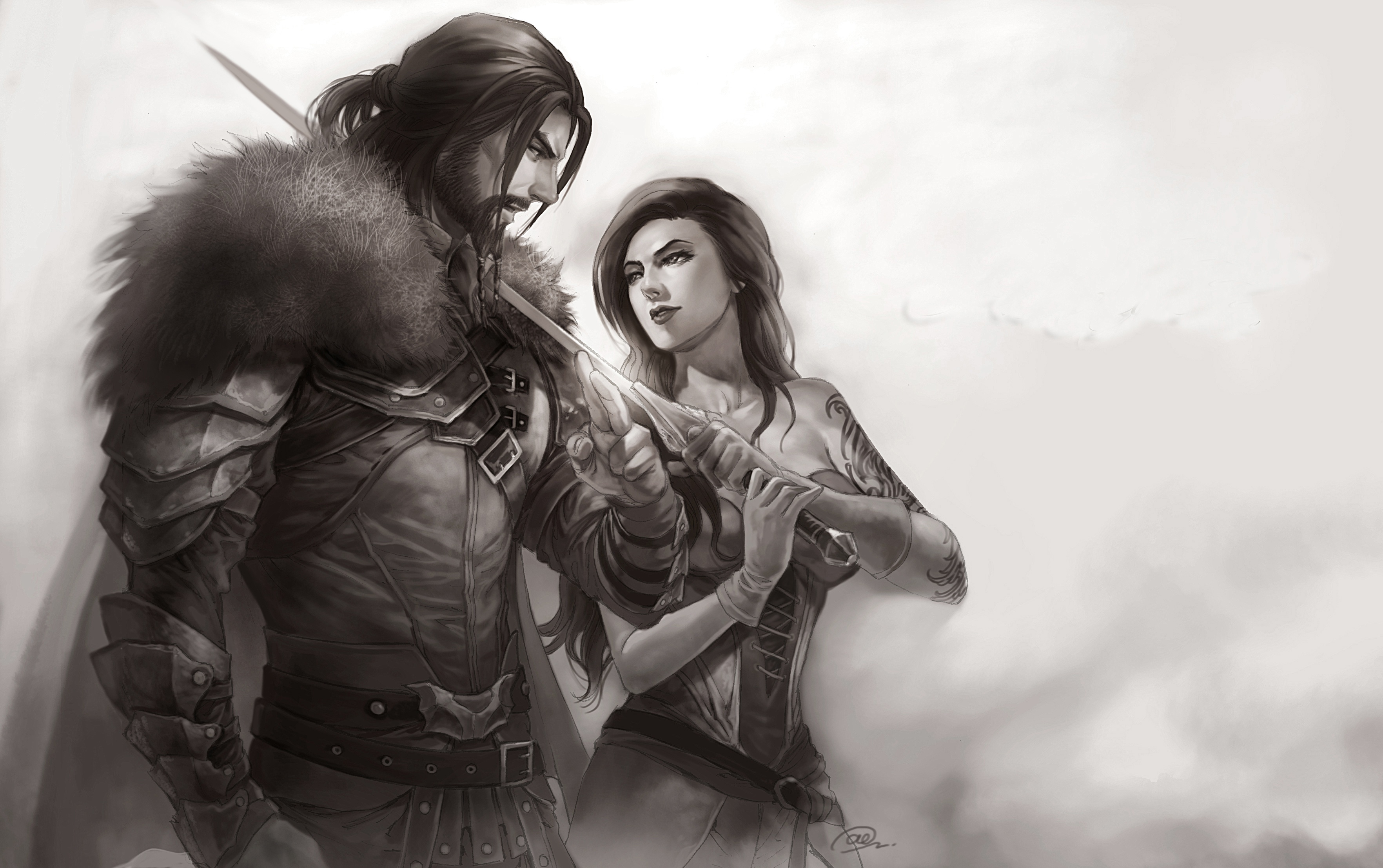 Отношения главных героев вполне стандартны для такой пары. Хакарк и Дарна вообще не понимают друг друга, все, что их связывает первое время - это обряд, сделавший их мужем и женой, и постель. Вот что-что, а спят они друг с другом с радостью, забывая на время обо всех своих разногласиях. Большую часть времени Дарна психует, злится, обижается, а Хакарк на все реагирует рыком и фразой "молчи, женщина!". Но, в принципе, чего еще ждать от наивной выпускницы монастырской школы и варвара, для которого женщина по большей части какая-то племенная кобыла. Это все раздражало и, честно говоря, хотелось по голове обоим надавать. Но потом Дарна вдруг чуть-чуть начинала думать, а Хакарк делал что-нибудь такое, что становилось понятно, что он все же волнуется и относится к жене намного теплее, чем пытается показать. И казалось, что не все так и плохо. Мне было интересно следить за тем, как они учатся понимать друг друга, потому что Дарна, например, умеет общаться с мужем исключительно намеками, двусмысленными фразами и жестами, как и положено истинной леди, в то время как Хакарк прямой как палка и не понимает, что во всех ее фразах есть какой-то тайный смысл, а гордо вздернутый подбородок обозначает что-то особенное.
