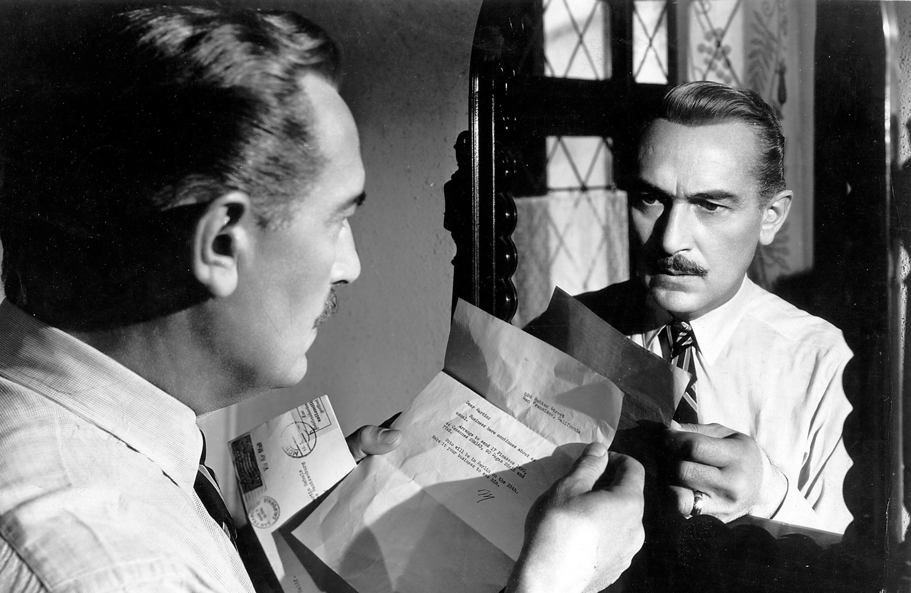 Кадр из Address Unknown 1944 года. В целом хороший фильм, но сюжетная линия в нём несколько изменена, вероятно, в угоду пуританским соображениям.В финале, столкнувшись с риском потерять всё, чем он так дорожит, Мартин в отчаянии переобувается в воздухе и просит Эйзенштейна о содействии. Не может же «дорогой» Максель, с которым он так давно знаком, позволить ему погибнуть?
