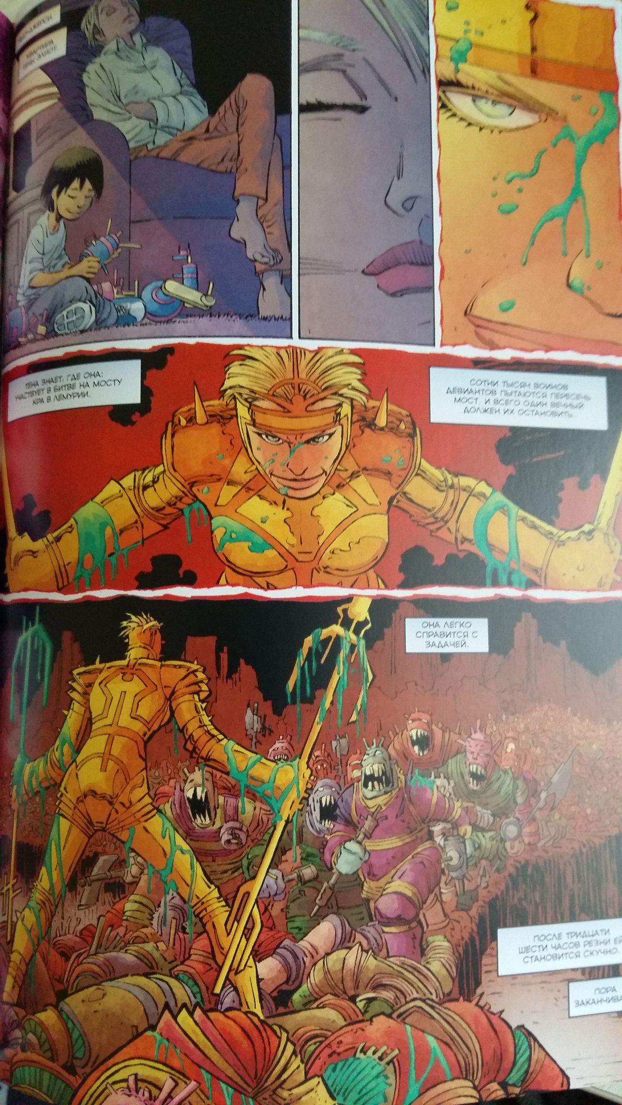 Может, эта ремесленность в работе с кадрами и цветом (под руководством Мэтта Холлингсворта) и делает искусственно путаный сюжет монотонным. Гейман позволяет себе слишком долгую экспозицию, чтобы сохранить детективную интригу, но успеть рассказать концепцию устройства мира для вновь прибывшей публики. В результате всё только запутывается сильнее. И сюжетный твист выглядит бледноватым.