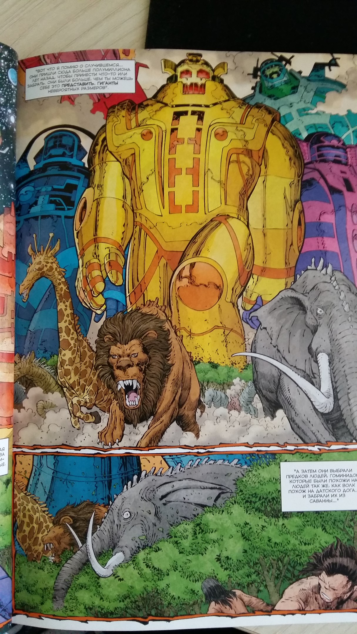 Ромита-мл. сохранил экспрессионистский дизайн Кирби, только сделал его более красочным, точным и стильным. Его рисунку, конечно, очень помогают современные цифровые и полиграфические технологии, позволяющие насытить оттенками и градиентами пространство космических технологий. И людей художник делает больше похожими на людей, с пропорциональными телами и нюансами мимики. Хотя общее графическое решение вполне комфортно для обычного читателя еженедельных выпусков. Разве только пробуждение божества в виде гигантского робота представлено на развороте в горизонтальном положении – тут книгу приходится развернуть, чтобы насладиться величием отблесков золота и бушующим пламенем.