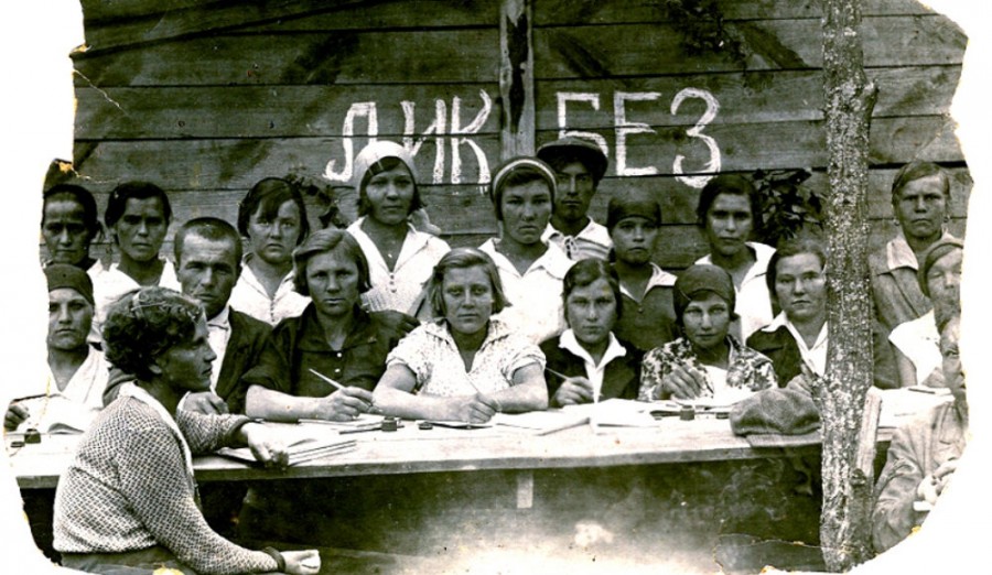 Она тотально борется с безграмотностью. Везде, по всей России открываются школы - ликбезы. И неважно мужчина ты или женщина, стар или млад, общество, которое строит новую жизнь без эксплуатации человека человеком должно быть равным - т.е. на 100% должно быть грамотным.