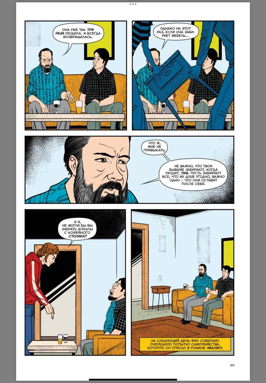 Что тут сказать. Нарисовано хорошо, красочно, весь текст хорошо читается. Сама история раскрыта очень интересно и доступно. Понятно, что многое остаётся за скобками, но основные моменты его жизни понятны и нам показываются. Тут есть отсылки к книгам Дика, которые даже я, не имея большого количества его книг за плечами, всё равно заметил.