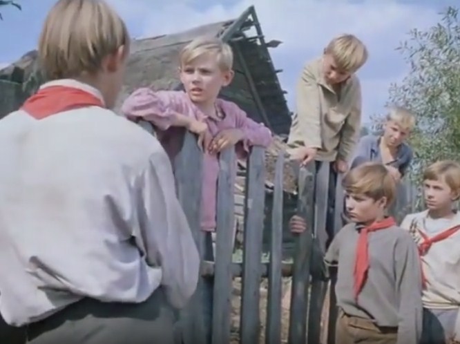 В кадре глава отряда Миша Поляков разговаривает с деревенскими ребятами: