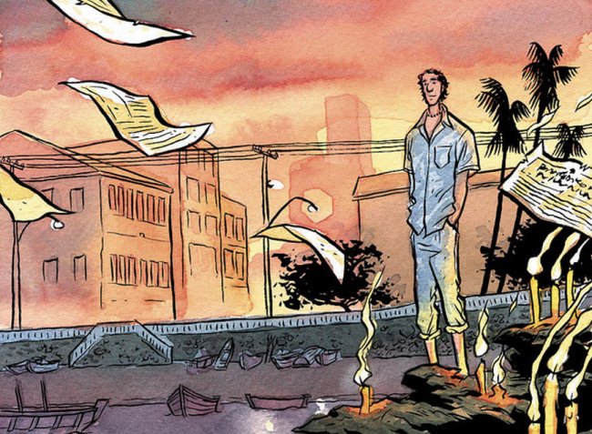 Читать далееДесять выпусков этой истории показывают нам самую обычную жизнь обычного человека. В каждом из них наш герой Брас де Олива Домингос (чёрт, всё-таки я не люблю имена латиносов) переживает какое-то значимое событие в своей жизни, и в конце умирает. Пожалуй, именно этим мне комикс больше всего не понравился - после прочтения каждого небольшого эпизода из жизни Браса у меня оставалось ощущение безысходности. Мечтает ли он стать таким же именитым писателем, как его отец, и боится идти на приём в его честь, потому что чувствует себя никчёмным в сравнении с ним; пишет ли он некрологи после крупной автокатастрофы, а затем вдохновляется и пишет свою великую книгу, исполнив свою давнюю мечту; влюбляется ли он в случайную знакомую в однодневном путешествии в другую страну; переживает ли крах многолетних отношений; встречает ли новую любовь в обычном супермаркете; рождается ли у него ребёнок - в любом случае Брас умрёт.