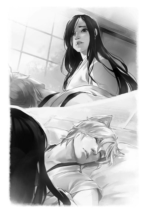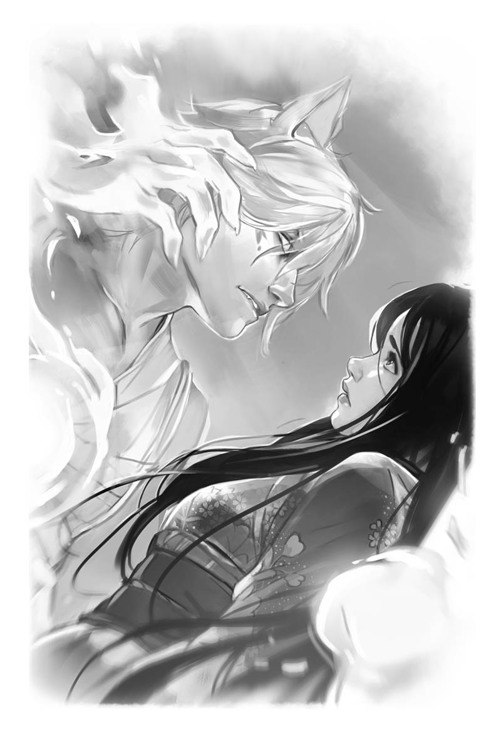Ну и третий мужчина - Юмэй - могущественный ёкай-ворон, известный в мифах и легендах под именем Тэнгу или Принц теней. Он помогает Эми и Широ искать пропавших куницуками (самых сильных духов земного царства), и путешествует вместе со сладкой парочкой. С точки зрения личностных характеристик, этот персонаж был чуть-чуть интереснее всех остальных: он жёсткий, суровый, хладнокровный и остранённый, но позднее мы постепенно замечаем, что чувства ему всё-таки не чужды. Однако его способность испытывать эмоции как будто бы погребена под огромным толстым слоем льда. Мне кажется, автор допустила большую ошибку в том, что не проработала Юмэя до конца, не рассказала историю его жизни, не раскрыла его полностью как личность, а ведь у него был огромный потенциал. История стала бы гораздо ярче и интереснее, если бы мы узнали какую-нибудь душещипательную драматическую историю о прошлом Юмэя, могли бы погрузиться в его голову и увидеть его мысли, страдания и переживания (например). Но, к сожалению, писательница обрисовывает образы всех героев слишком поверхностно, не давая нам узнать их глубже, и в результате у меня даже не возникало желания им сопереживать и сочувствовать.