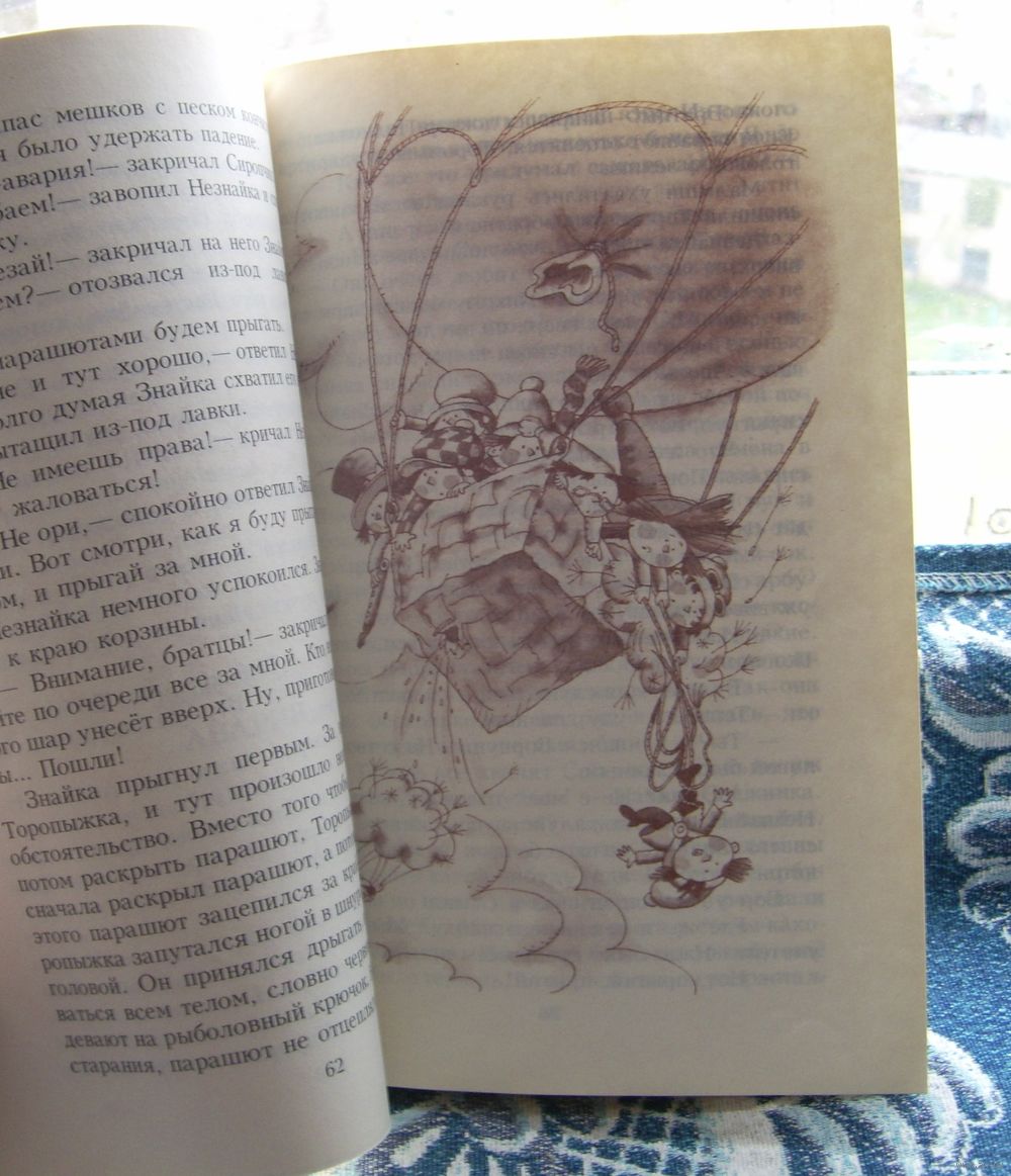 Только НЕ читайте его, пожалуйста, своим детям – сядьте с ними рядом и послушайте, как дети САМИ прочтут вам его. Мой сын управился с этой книжкой за 2 недели.Хорошо также после прочтения первых глав начинать смотреть серии длинного советского мультфильма, поставленного по первым двум книгам о Незнайке и его друзьях. Первые десять серий мультфильма как раз передают содержание этого романа. Тут дети смогут увидеть, чем отличаются «мультяшные» герои от героев книги, а также узнают, в чём отличие постановки от повествования.