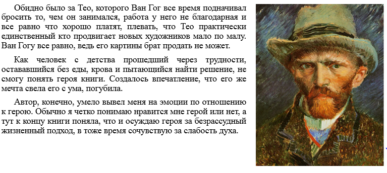 К своему стыду хочу признаться, что мне было невыносимо скучно читать эту книгу. В одной из рецензий встретила мнение, что роман похож на длинную статью из Википедии, и могу сказать, что я согласна с этим сравнением. Для меня это недостаточно художественная история о сложной и трагической судьбе талантливого человека. На протяжении всего повествования во мне боролись два чувства к Винсенту Ван Гогу: жалость из-за непонимания и неприятия его окружающими, а также раздражение от его нежелания приспособиться к жизни и хоть как-то обеспечить самого себя. Для меня главным героем во всей этой истории стал младший брат художника - Тео Ван Гог. Именно этот человек показал себя, как образец терпения и и стал для меня примером настоящей братской любви. Если бы не он, то возможно Мир вообще бы не узнал о талантливом художнике, который умер бы ещё до того, как обнаружил в себе желание быть живописцем от голода и болезней в городке углекопов в период неудачной карьеры проповедника. Именно Тео приходилось содержать ищущего себя брата: оплачивать жильё, пропитание, лечение и расходные материалы для работы; а иногда ещё и женщин, и друзей художника. Именно Тео ставил под угрозу свою успешную карьеру, пытаясь продавать картины брата и открывать новые имена. Именно его самоотверженность и посвящение своей жизни достаточно непутевому брату не дали возможности существовать ему после смерти Винсента.