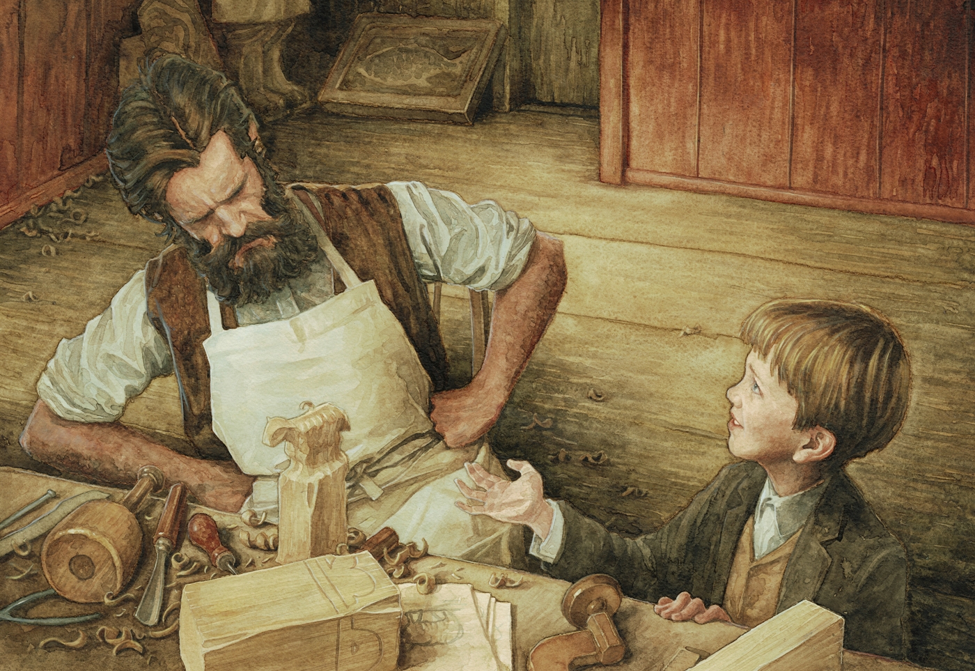 Сидя за работой, к нему раз в несколько дней приходит вдова со своим сынишкой. Он просит их сидеть тихо: вдова вяжет, а мальчишка не сводит глаз.