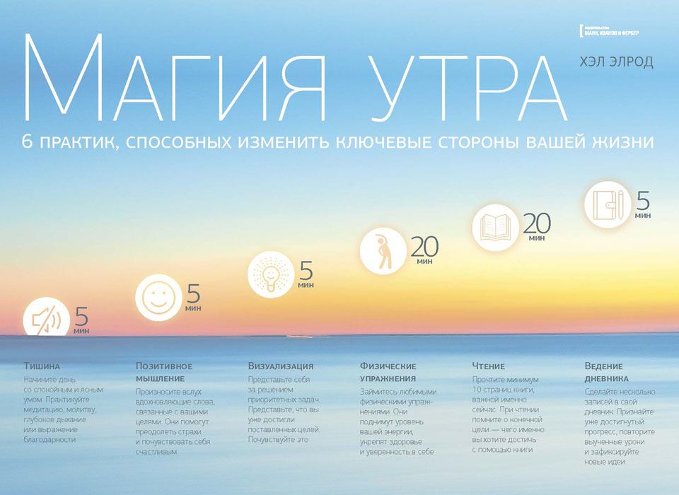 Ну ещё автор уделил большое внимание неким «спасательным кругам» на пути к успеху, к которым надо прибегать утром:- Тишина (медитируй, молись, размышляй);