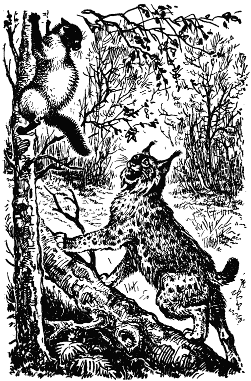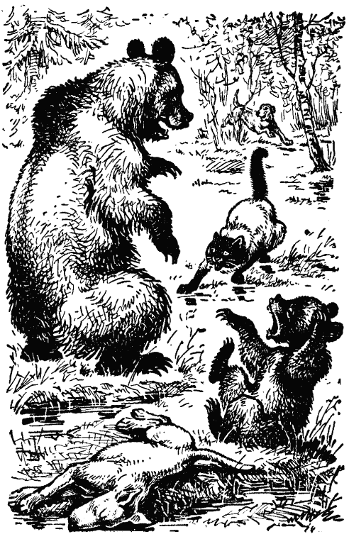 Из-за поворота, на тропке, держа в зубах за крыло большую мертвую куропатку, появился кот. Увидев, что происходит, он открыл пасть, куропатка выпала из нее, а кот стал неузнаваем: хищно засверкали голубые глаза на черной ощерившейся морде, шерсть встала дыбом, отчего кот теперь казался вдвое больше обычного. Распушив шоколадный хвост, он хлестал им себя по бокам. Потом, сжавшись, припал к земли, издал пронзительный вопль и, когда испуганный медвежонок обернулся, прыгнул на него. Крепко вцепившись задними лапами в темный пушистый загривок, он стал царапать острыми когтями морду и глаза медвежонка, шипя и фыркая, пока медвежонок, ослепнув от крови, не завопил от боли и ужаса»