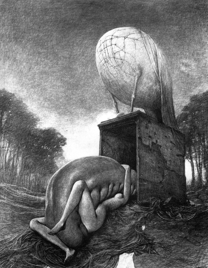 Немудрена распространённость того мифа, что женщины не способны получать удовольствие от полового акта – конечно, столетиями принуждаемые к этому женщины неспособны. Однако я знаю нескольких парней, которые так считали до тех пор, пока их девушки не обнаруживали это и не разубеждали их. ЧЗЧ! Ну в самом деле. Симонушка, конечно, пишет, что это не так, но при этом делит виды оргазма… ЧЗЧ! Как можно отделять клиторальное возбуждение от вагинального, в то время как оба – части одного процесса, и без любого из них, как и без симпатии к партнеру, удовольствие неполно? Не могу судить о том, как переживают оргазм мужчины, но помню, как была поражена тем, что эту картину нарисовала не женщина:Это Здислав Бексиньски, прекрасный польский сюрреалист. Если ощущения женщин и мужчин столь различны, как об этом говорят, откуда он знает, что во время оргазма чувствует женщина? Кто ему рассказал? И нет, я не извращенец и не спариваюсь с непонятными гигантскими червяками. Просто здесь наглядно показано стремление раствориться и не чувствовать ни рук, ни ног партнёра, а вообще его – всего и со всех сторон.