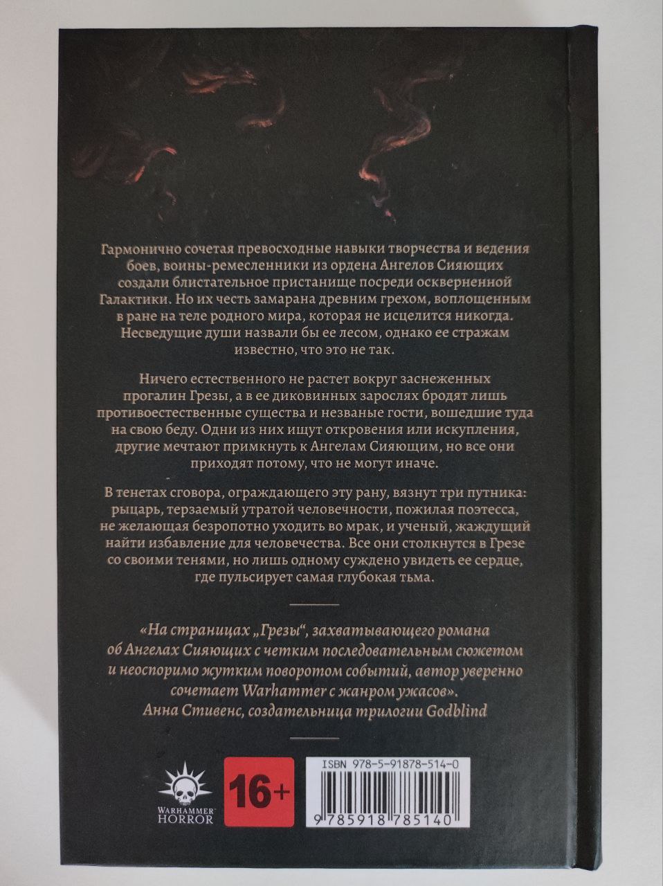 После переваривания произошедшего в книге, кратко о ней можно сказать так. Это история об одном ордене Сияющих, который поощрал творчество. В соседней локации, именуемой Греза, зародился Хаос, который проглядели. Пошло заражение и чтобы Империум не узнал, тупо в конце всех вырезали. Конец