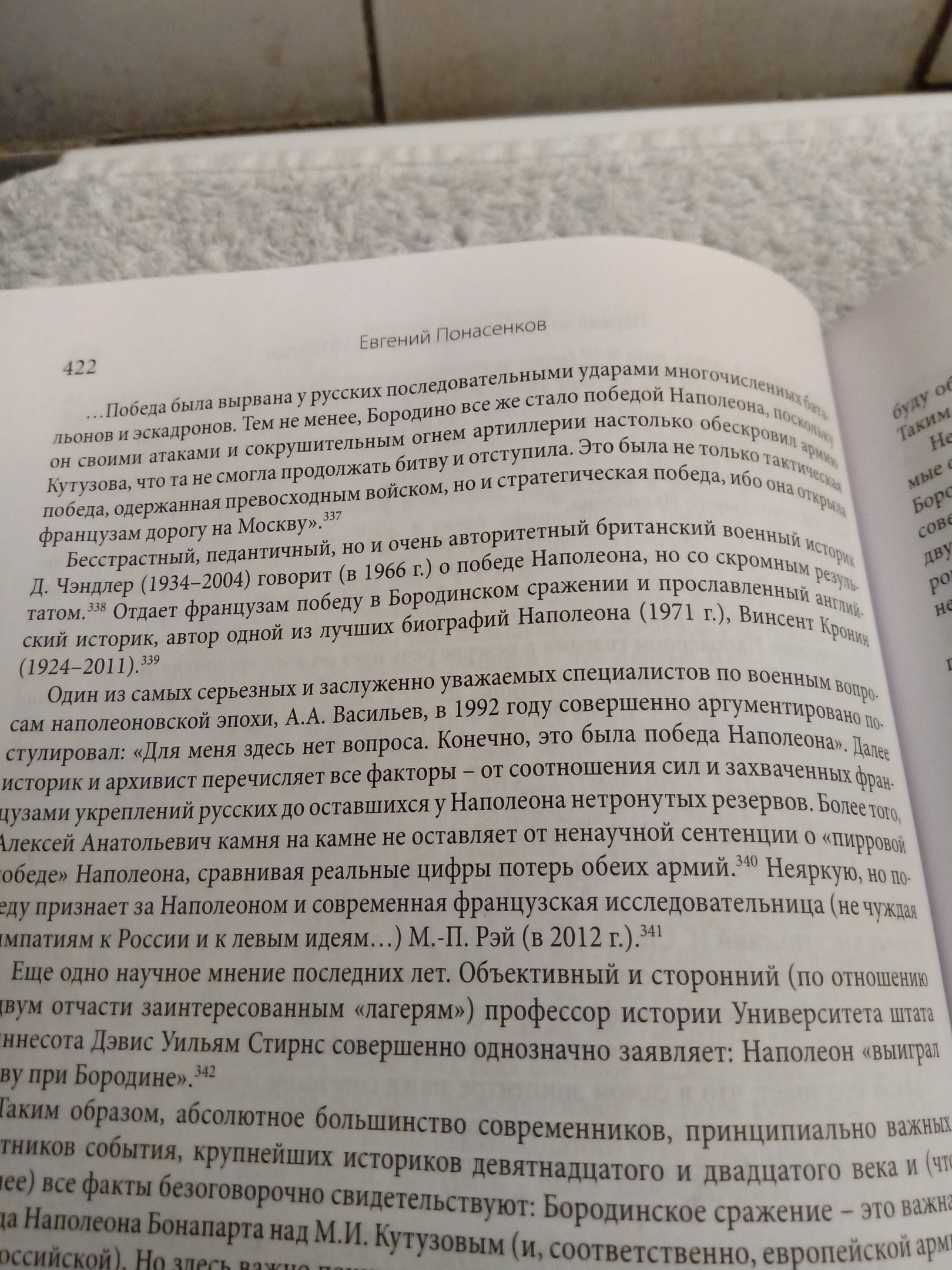 Уже погрузившись в тему могу сказать, что Книга Маэстро действительно Первая Научная история войны 1812 года, имперско-совковая макулатура и книги, вышедшие до этого, не идут ни в какое сравнение. Замойский — 312 страниц и, как выяснилось, не считает Наполеона военным гением, лол, Троицкий — 352 страницы и марксист, Синяя Монография Маэстро — 408 страниц. Так что кукарекают про название книги те, кто не знаком с историографией.